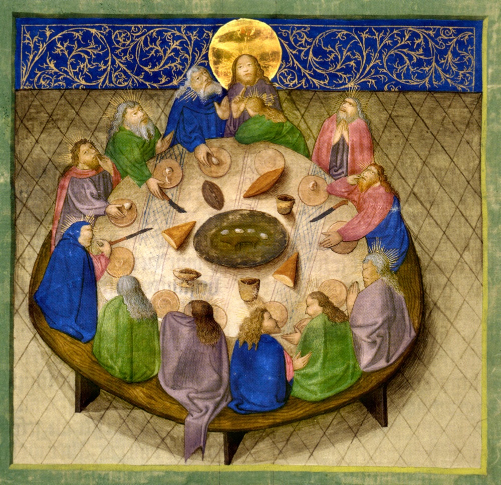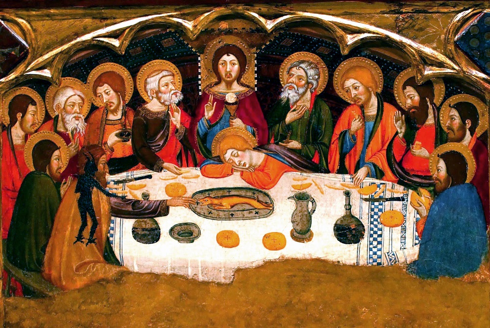 Quest’ultimo siede proprio alla destra di Cristo e lo riconosciamo solo perché la sua aureola è interrotta, brilla sull’abito, ma non sul capo. Giuda è un chiamato, ma liberamente si è sottratto all’elezione. Un altro segno di riconoscimento per l’Iscariota è il gesto di mettere la mano nel piatto di Gesù. La miniatura, infatti, illustra il vangelo di Matteo. Nei sinottici Gesù indica il traditore come Colui che intinge la mano nel piatto, mentre in Giovanni Gesù stesso gli porge il boccone sacrilego. Lo sguardo dell’anonimo bavarese è pieno di misericordia per quest’umanità inconsapevole della gravità dell’ora. Giuda non si trova confinato in un angolo, è lì, in mezzo a tutti. Tutti mangiano un cibo che sarà farmaco d’immortalità. Al centro della tavola, sorprende come accanto all’agnello ci siano quattro uova, altre sono nel piatto di quattro apostoli, tra i quali Giuda. Le uova, alimento prescritto dalla Pasqua ebraica, sono un simbolo di rinascita e di risurrezione. Qui sono otto, segno di quella vita assolutamente nuova che Cristo è venuto a portare. Anche il pane è a forma di mandorla, altro simbolo di vita. Sul pavimento e sulla tovaglia ci sono losanghe segni di quella rete di morte che si abbatterà sopra il Salvatore. La tavola rotonda, diventata famosa per i cercatori del Santo Graal, è dunque il segno di quella mensa celeste dove Cristo passerà a servirci. A un tale banchetto si accede solo mettendosi in gioco. L’ombra del tradimento avvolge tutti, ma soccombe chi si ciba in modo indegno. Nel recente dibattito su chi ammettere all’Eucaristia forse non si è tenuto conto di un fattore fondamentale: ricevere la comunione significa condividere il sacrificio di Cristo per l’umanità, offrire se stessi per la salvezza del mondo. Dunque non un privilegio, ma la partecipazione a un parto che le uova e il pane a forma di mandorla del miniaturista bavarese annunciano.