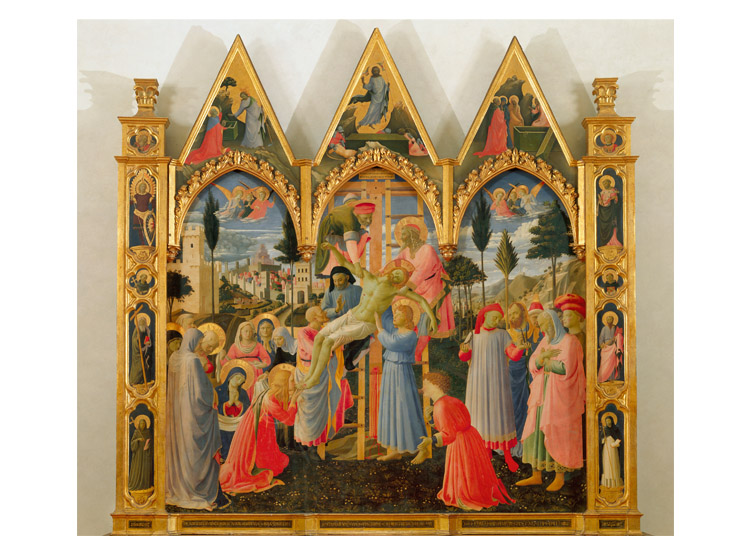 Per l’ostensione della Sacra Sindone del 2015, il Museo di San Marco di Firenze ha prestato al Museo Diocesano di Torino un’opera nata dalla stessa fede intensa che caratterizza il pellegrinaggio sindonico: il Compianto sul Cristo morto del Beato Angelico. Realizzato tra la fine del quarto e l’inizio del quinto decennio del XV secolo, il dipinto appartiene al periodo in cui la Sindone cominciò a essere conosciuta fuori della Francia, e forse a essa allude il telo bianco finissimo che si vede sotto il corpo del Salvatore. Eseguito su tavola, il Compianto era in origine una pala d’altare, e sotto questo telo dobbiamo immaginare la tovaglia della mensa eucaristica, come sotto il corpo di Cristo raffigurato dobbiamo immaginare l’ostia e il calice del vino: il Corpus Christi sacramentale in cui la fede vede realmente presente il Figlio di Dio e di Maria. Celebre tra i teologi del Sacramento fu il domenicano Tommaso d’Aquino, la cui idea viene tradotta qui in immagine da un altro celebre domenicano, frate Giovanni da Fiesole, noto già nel Quattrocento come il “pittore angelico”.