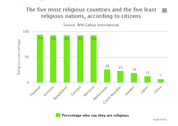 - Thailand is the most religious country globally (94%), followed by Armenia (93%), Bangladesh (93%), Georgia (93%), and Morocco (93%).