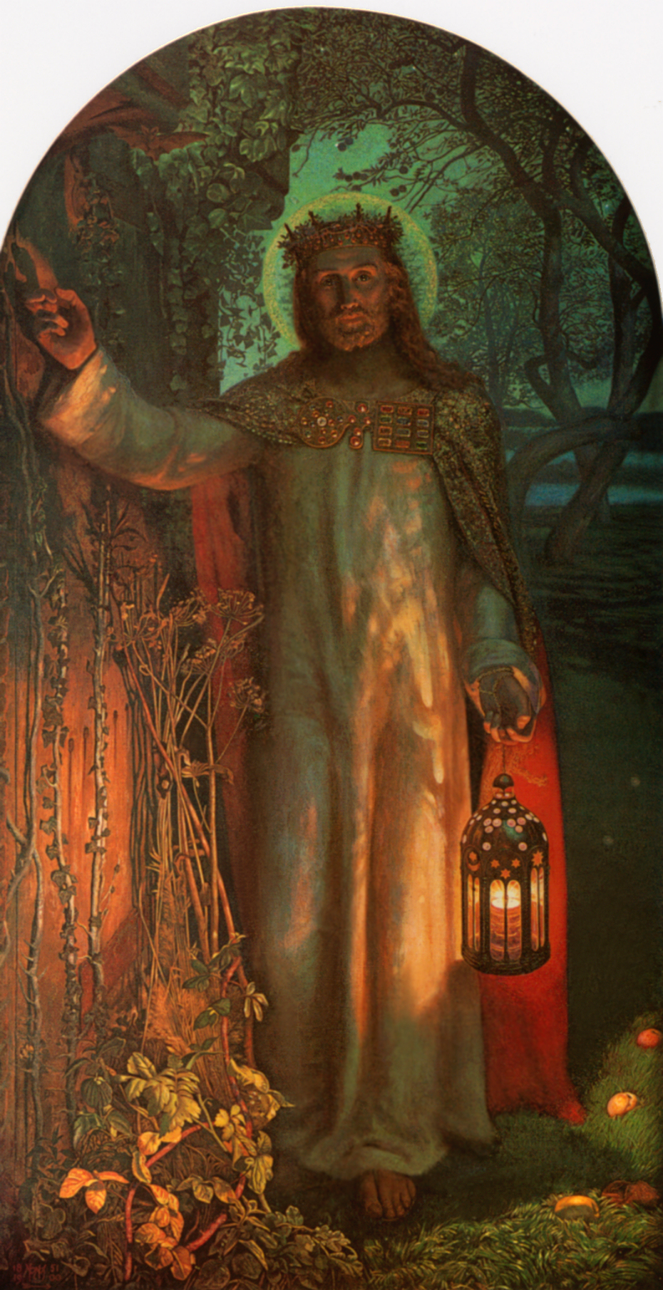 Dietro le sue spalle si vedono alberi nudi, avvolti in un inverno senza rimedio, ma là dove egli passa, gli alberi rinverdiscono e la vita fiorisce. Lo dimostra l’edera, simbolo di fedeltà e di eternità, che s’inerpica lungo la porta, proprio davanti a Gesù, lo dimostra il finocchietto selvatico che annuncia l’inganno in cui è stato tratto il diavolo. Come i dolci al finocchietto erano serviti per cambiare il sapore del vino meno buono e ingannare il cliente, così l’umanità del Signore ha ingannato il serpente antico. Questi ha addentato la preda per ucciderla, ma poiché Cristo è vita, è la vita non può morire, ecco che la morte (il serpente antico, il diavolo) è rimasta uccisa. Cristo guarda pensoso, mentre bussa, quasi presentendo che nessuno avrebbe aperto, che il suo richiamo sarebbe rimasto inascoltato. La porta dove bussa, infatti, non ha maniglia esterna, si apre solo da dentro.