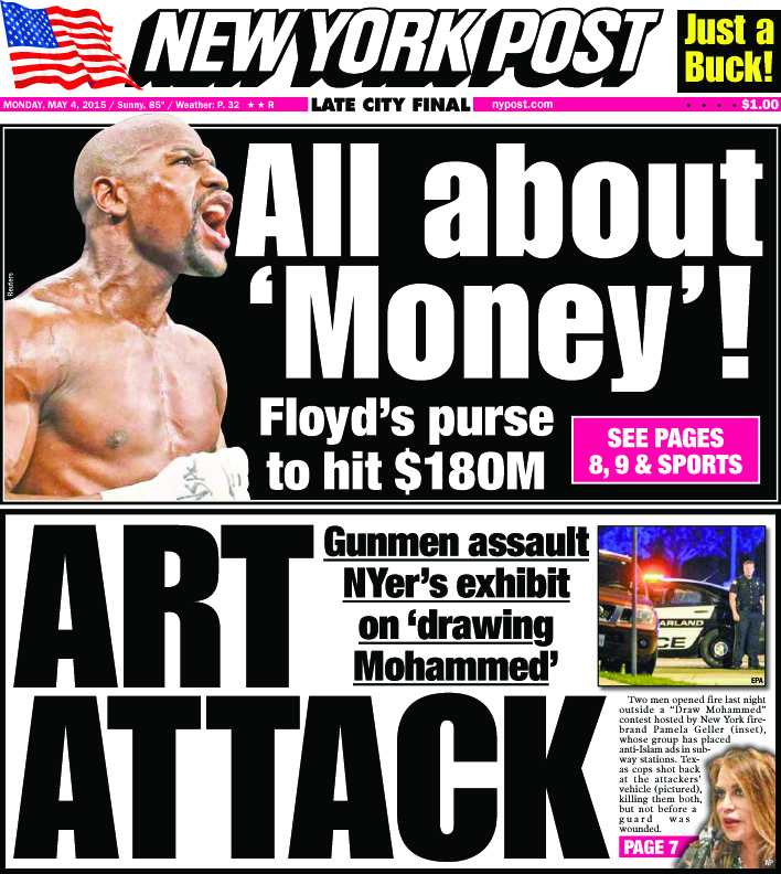 The New York Post headline read “Art Attack” over a detailed report about the deadly assault—for the gunmen at least—at a convention center in Garland, Tex. The two men had attempted to storm an exhibit put together by the professional provocateur Pamela Geller through her American Freedom Defense Initiative. I haven’t seen any of the depictions of Muhammad that comprised the “Draw the Prophet” exhibit, but I am willing to speculate that there was more agitation than art hanging from its walls.