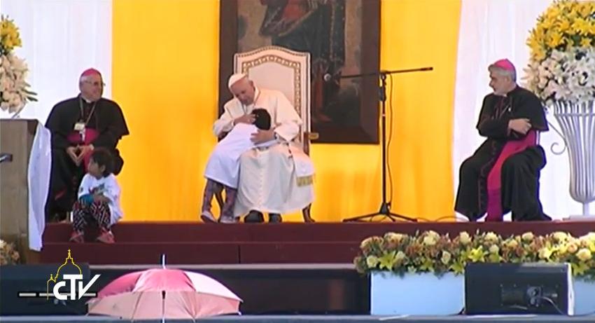 Me conmuevo cuando veo a muchas madres cargando a sus hijos en las espaldas. Como lo hacen aquí tantas de ustedes. Llevando sobre sí la vida y el futuro de su gente. Llevando sus motivos de alegría, sus esperanzas. Llevando la bendición de la tierra en los frutos. Llevando el trabajo realizado por sus manos. Manos que han labrado el presente y tejerán las ilusiones del mañana. Pero también cargando sobre sus hombros, desilusiones, tristezas y amarguras, la injusticia que parece no detenerse y las cicatrices de una justicia no realizada. Cargando sobre sí, el gozo y el dolor de una tierra. Ustedes llevan sobre sí la memoria de su pueblo. Porque los pueblos tienen memoria, una memoria que pasa de generación en generación, los pueblos tienen una memoria en camino.