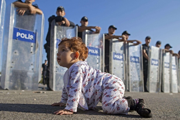 Li abbiamo visti, nelle foto alle frontiere, camminare per chilometri, correre con i figli in braccio, avanzare con i gomiti sotto il filo spinato. Oggi una piccola siriana ha fatto la cosa per lei più naturale, gattonare, davanti a un cordone di polizia in tenuta antisommossa. Con il pigiamino puntellato di pupazzetti, il bavaglino, il ciuccio, le manine e i piedini veloci, è a suo agio sull’asfalto dell’autostrada Istanbul-Edirne, dove la sua famiglia aspetta con migliaia di profughi il permesso di passare il confine greco turco per raggiungere la Germania.