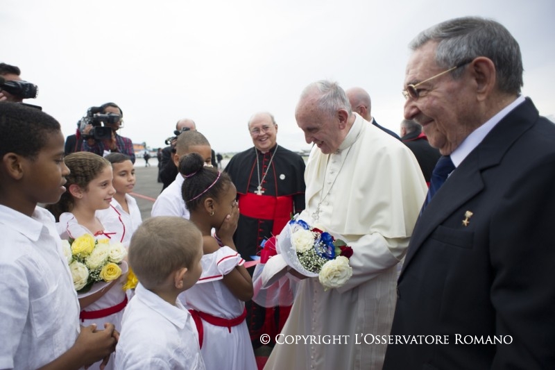 Al Suo arrivo Papa Francesco è stato accolto dal Presidente del Consiglio di Stato e del Consiglio dei Ministri della Repubblica di Cuba, Sig. Raúl Castro e dall’Arcivescovo di San Cristóbal de La Habana, Card. Jaime Lucas Ortega y Alamino. Erano inoltre presenti alcune Autorità dello Stato, i Decani regionali del Corpo Diplomatico, i Vescovi di Cuba e un gruppo di fedeli.