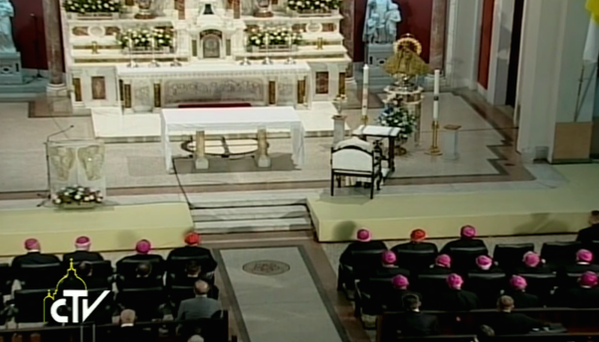 Acompañado por el Arzobispo de Santiago de Cuba, Mons. Dionisio Guillermo García Ibáñez, el Santo Padre ingresó a la Basílica menor con un ramo de flores y rezó de pie ante la Virgen. El Pontífice Padre hizo la señal de la cruz ante la imagen y dejó las flores ante la imagen de la Madre de Dios. Durante unos minutos se sentó luego para seguir su oración en silencio durante unos minutos acompañado solamente por el séquito papal y por todos los obispos cubanos.
