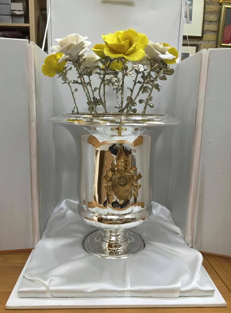 Al concluir, Francisco encendió un gran cirio blanco junto a la imagen y dejó el especial regalo que llevó hasta ahí: un florero de plata con flores con tallos de plata y pétalos de cerámica.