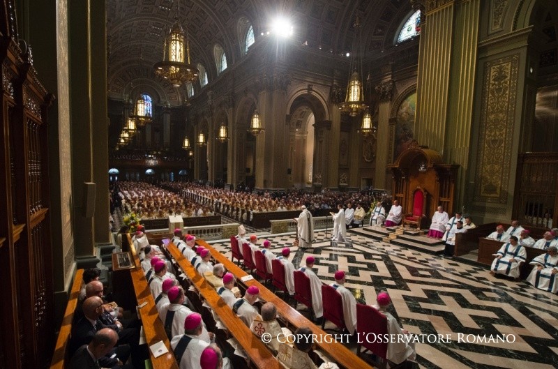 Accolto a Philadelphia dall’Arcivescovo S.E. Mons. Charles Joseph Chaput, OFM Cap., e da alcune Autorità locali, il Papa si è recato in auto alla Cattedrale Basilica dedicata ai Santi Pietro e Paolo dove, alle ore 10.30, ha presieduto la Celebrazione Eucaristica con i Vescovi, i sacerdoti, i religiosi e le religiose della Pennsylvania.