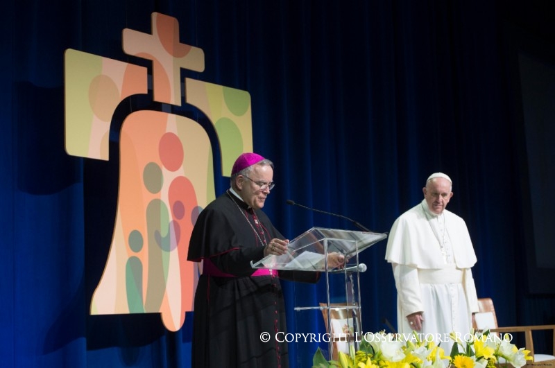 A loro il Papa, dopo il saluto dell’Arcivescovo di Philadelphia, S.E. Mons. Charles Joseph Chaput, si è rivolto comunicando l’incontro appena avvenuto con un gruppo di persone abusate quando erano bambini (cfr Boll n. 729), ed ha poi pronunciato il discorso previsto.