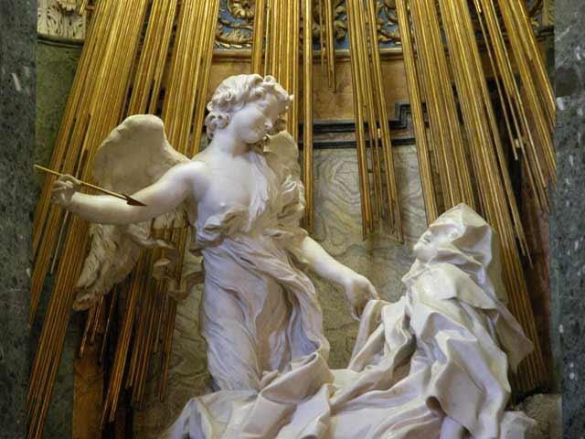 La sua fortuna è stata segnata da quell’istante di visitazione ardente di cui la Vita è testimone e Bernini supremo interprete: «Volle il Signore che, trovandomi in questo stato, avessi più volte la seguente visione. Vedevo un angelo accanto a me, a sinistra, in forma corporea: cosa che non mi accade che rarissime volte. […]. Gli vedevo nelle mani un lungo dardo d’oro, che sulla punta di ferro mi sembrava avere un po’ di fuoco. Pareva che me lo configgesse a più riprese nel cuore, così profondamente che mi giungeva fino alle viscere, e quando lo estraeva sembrava portarselo via lasciandomi tutta infiammata di grande amore di Dio. Il dolore della ferita era così vivo che mi faceva emettere dei gemiti, ma era così grande la dolcezza che mi infondeva questo enorme dolore, che non c’era da desiderarne la fine, né l’anima poteva appagarsi che di Dio.