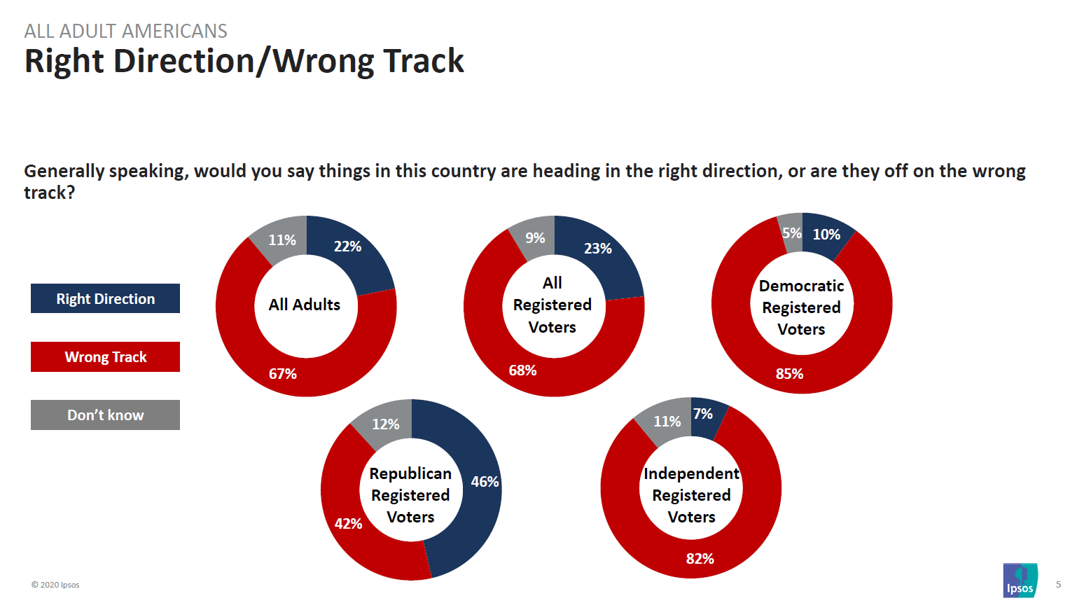 Il futuro del Paese preoccupa fortemente gli americani: due su tre ritengono che il Paese stia andando nella direzione sbagliata, mentre solo il 22% si mostra fiducioso ed è convinto che vada nella direzione giusta. A questo proposito gli elettori repubblicani si mostrano divisi, infatti il 46% si dichiara ottimista, mentre il 42% è pessimista: quest’ultimo dato è in forte crescita, basti pensare che nello scorso mese di febbraio i repubblicani pessimisti erano la metà di quelli attuali (21%). (…)