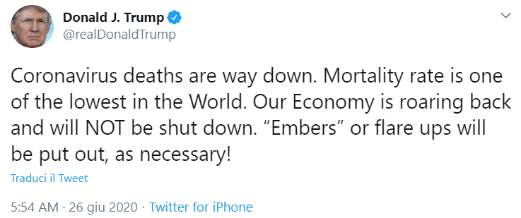 Lo stesso presidente, dal palco di Tulsa, in Oklahoma, dove ha tenuto il primo comizio post-lockdown, aveva annunciato di aver ordinato di rallentare i test “perché un loro aumento comporta un incremento dei casi”. Un’affermazione subito smentita dal suo staff, che si è affrettato a spiegare che il presidente “stava scherzando”. Ad aumentare davvero, invece, c’è il distacco che lo separa nei sondaggi dallo sfidante dem Joe Biden avanti di 14 punti col 50% delle preferenze. Un’enormità, che il presidente in carica bolla come “falsità” frutto dei “fake news media” che gli remano contro.