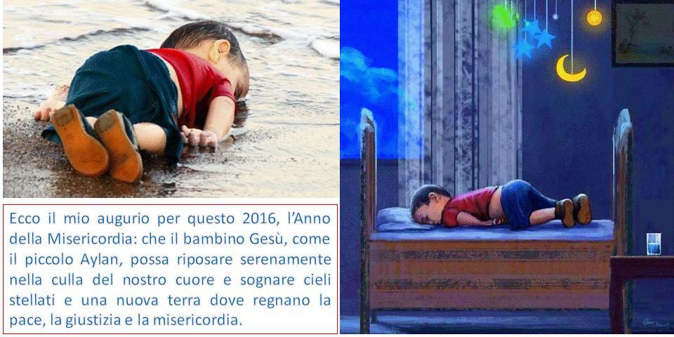 Ecco il mio augurio per questo 2016, l’Anno della Misericordia: che il bambino Gesù, come il piccolo Aylan, possa riposare serenamente nella culla del nostro cuore e sognare cieli stellati e una nuova terra dove regnano la pace, la giustizia e la misericordia.