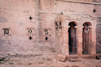 Efectivamente, había once iglesias rupestres, diez de las cuales se repartían en dos conjuntos de cinco iglesias y cada una conectaba a la roca madre por una o varias paredes o por el techo. Llamadas Biet Medhani Alem, Biet Mariam, Biet Maskal, Biet Mikael o Biet Gabriel Rafael, estaban efectivamente dedicadas a Jesús, a María y a unos cuantos ángeles y santos. Y todas estaban esculpidas en la roca. También el interior.