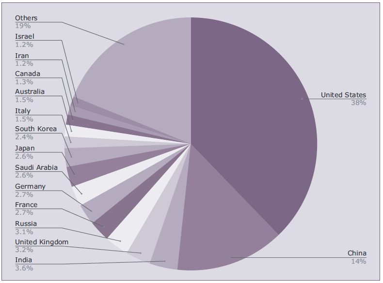 I primi 5 paesi rappresentano il 62% della spesa militare mondiale. Stati Uniti e Cina da soli rappresentano il 52%.