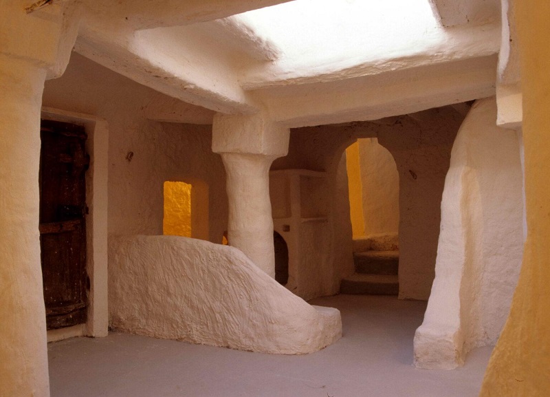Le città sono costruite in posizione adiacente agli appezzamenti coltivati, prestando attenzione a non sottrarre suoli preziosi per l’agricoltura e beneficiando della presenza del verde: l’ombra delle palme e i piccoli corsi d’acqua corrente creano infatti un microclima completamente diverso dall’aridità implacabile del deserto.
