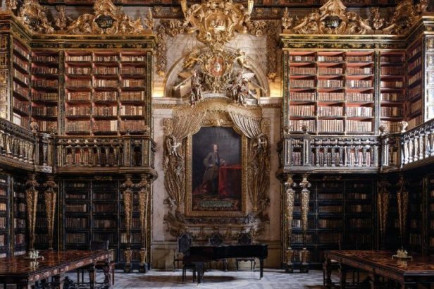 Quella di Coimbra si inseriva in un edificio antico di 700 anni, ormai privo di una sala adeguata allo scopo. Nel 1716 i gesuiti chiesero a Giovanni V l’autorizzazione per un ampliamento. Il re andò ben oltre e diede vita a quella che sarebbe diventata nota come “Biblioteca Joanina”, ammirata e descritta dai viaggiatori come la “più fastosa mai vista”. La casa da livraria si sviluppò in verticale, sfruttando un dislivello tra corti: al piano terra i magazzini, un piano intermedio con gli studi dei professori, quindi le sale pubbliche al livello del cortile superiore. Costruzione, decorazione, boiserie e arredi sono «esempio insuperabile del barocco europeo e in particolare di quella che chiamiamo arte delle biblioteche, nonché senza dubbio una delle più sontuose mai ideate, la casa da livraria sarebbe diventata la Biblioteca universitaria per antonomasia». Le tre sale, rivestite da altissime scaffalature e di colore diverso per ogni ambiente, sono concatenate attraverso una serie di tre portali che inquadrano, come una pala d’altare, il ritratto del re. Giovanni non si limita a dotare Coimbra di una biblioteca magnifica e tecnicamente all’avanguardia ma coglie l’occasione per una ristrutturazione più profonda, facendone il perno del programma reale di rinnovamento.