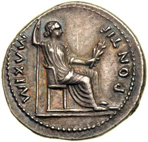 Sull’altro lato vi è l’immagine di una donna (generalmente si pensa che sia la madre di Tiberio, Livia) vestita come Pax (Pace), che mantiene un’asta e un ramo di ulivo. L’iscrizione è PONTIF MAXIM, un’abbreviazione di “Pontifex Maximus”, che significa “Pontefice massimo”, che era un altro dei titoli di Tiberio.