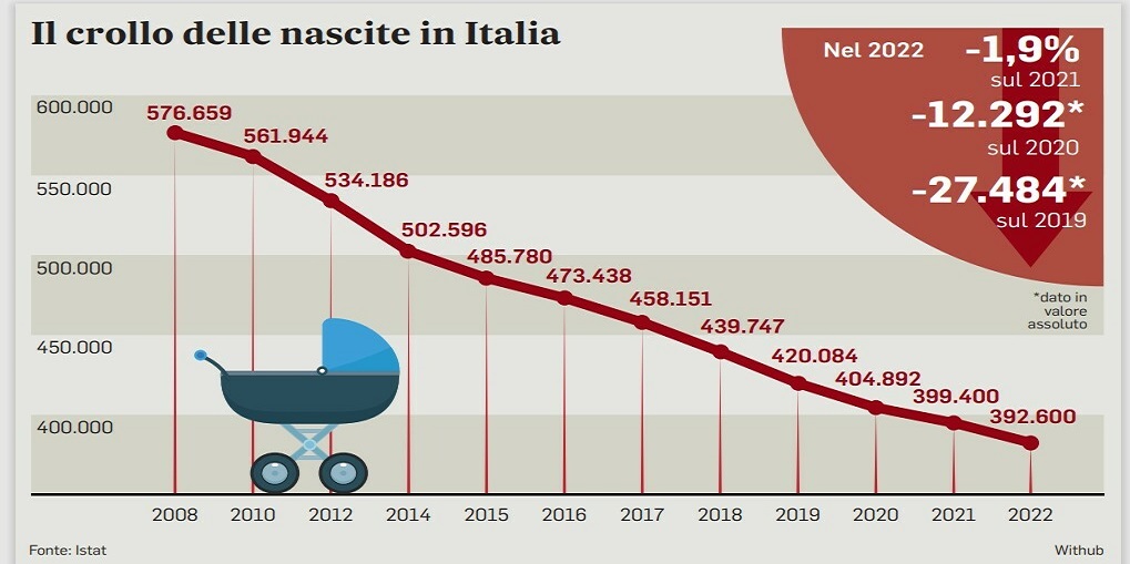 Ad un’attenta lettura, i numeri suggeriscono che ci sono motivi economici ma anche culturali, come dimostra il fatto che anche gli stranieri una volta giunti in Italia danno forma a strutture famigliari molto più ristrette rispetto quelle dei lori Paesi d’origine. I demografi hanno più volte avvertito che questo trend farà saltare il sistema pensionistico, la sanità pubblica e l’intero welfare italiano, dal momento che una piccola percentuale di popolazione attiva dovrà sostenere milioni di anziani fuori dal mercato del lavoro. Lo statistico già presidente dell’Istat Gian Carlo Blangiardo stima che solo gli ultra novantenni tra trent’anni saranno oltre 2,5 milioni. Ma non si tratta solo di fredde previsioni economiche, meno figli significa meno apertura alla vita, meno speranza, meno energia e capacità di rigenerazione. In poche parole significa che un popolo si ripiega su sé stesso, sull’individualismo e sul nichilismo dei bisogni immediati senza una prospettiva per il futuro.