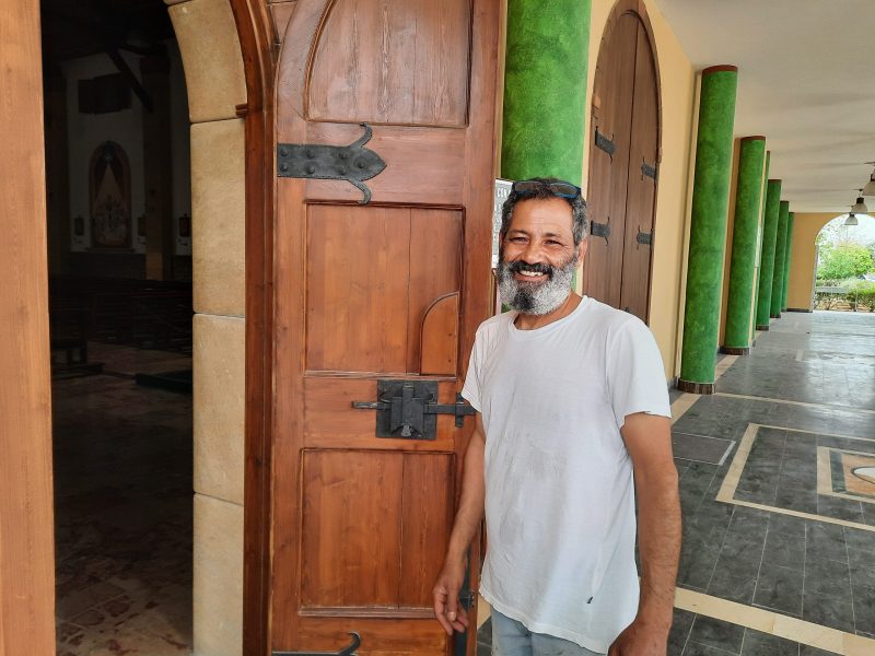 Bekir, tunisino di Sousse, pittore e decoratore, ha lavorato con fratel Biagio per 27 anni. L’incontro con il missionario, dopo aver avuto problemi con la giustizia, gli ha cambiato la vita. Ora è sposato con figli, e nonostante sia musulmano partecipa attivamente alla vita della missione. Con maestranze tunisine e indiane hanno iniziato a costruire la chiesa quasi a mani nude, senza l’ausilio di architetti. Bekir è l’autore delle icone copte dipinte a olio sulle pareti laterali interne. È lui a farci da guida nella cittadella. “L’altare è stato realizzato a mano con pietre trovate qui – racconta -. Le tavole della Via Crucis sono state scolpite da un ragazzo del Ghana che poi è partito per andare a morire nel suo Paese. Il mosaico sull’abside è stato fatto con il contributo di persone con disabilità. Ognuno ha voluto donare qualcosa”.