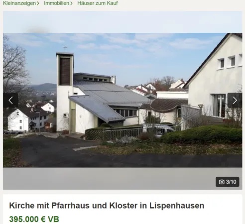 L’inserzione, che oggi non è più presente, datava nove febbraio e ha avuto oltre venti offerte concrete di acquisto, di cui tre serie, ha spiegato il parroco Andreas Schweimer. La descrizione del lotto evidenziava la bella posizione della proprietà, situata su una collina nel centro del paese con vista sulla valle del Fulda. Oltre alla chiesa del 1963 «completamente attrezzata con un altare e banchi per settanta persone», ci sono: una sala riunioni nel seminterrato; una canonica con sei stanze, cucina, bagno e cantina; un’ala aggiunta nel 1980 con otto celle conventuali e due bagni; una strada di accesso e posti auto. L’annuncio precisa che «gli edifici possono essere utilizzati sia per scopi spirituali che residenziali».