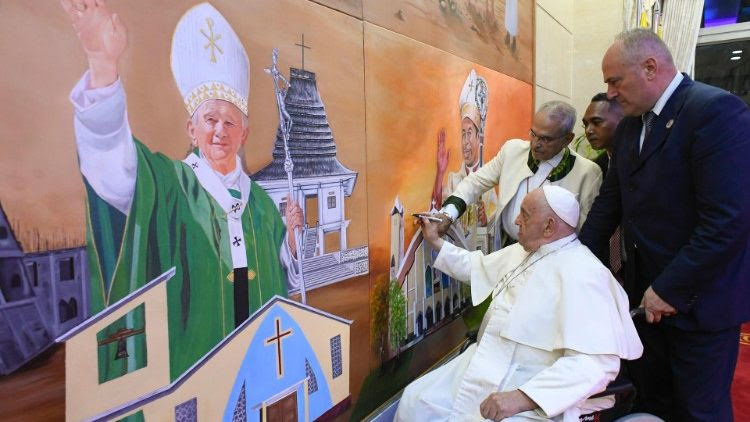 A essere stato di grande aiuto, per il Pontefice, è stato il “radicamento della fede cattolica”, già messo in rilievo da San Giovanni Paolo II durante la sua visita nel 1989 ed espressione di quel cristianesimo, nato in Asia tramite i missionari europei “testimoniando la propria vocazione universale e la capacità di armonizzarsi con le più diverse culture, le quali, incontrandosi con il Vangelo, trovano una nuova sintesi più alta e profonda”. Inculturazione della fede ed evangelizzazione della cultura, aggiunge, sono infatti un binomio importante per la vita cristiana. Ne è un esempio il quadro situato alle spalle del Papa nella sala dove si trovava il Libro d’Onore, in cui appaiono i primi missionari portoghesi, i primi edifici missionari, un’immagine di Papa Wojtyla e il primo cardinale timorese, che lo stesso Francesco ha firmato prima di lasciare il palazzo presidenziale. Insegnamenti evangelici e continuità nella fede che hanno guidata “a una piena riconciliazione con i fratelli dell’Indonesia”. Una “politica della mano tesa” particolarmente lodata dal Papa.