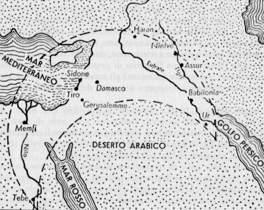 La regione del Vicino Oriente antico che ci interessa fa parte di quella vasta zona chiamata comunemente «mezzaluna fertile», cioè quella fascia di terre coltivabili che si estende dalla Mesopotamia ad est, ai monti dell’Anatolia a nord, fino al mar Mediterraneo a ovest. A sud si estende una regione interamente desertica, il grande deserto arabico. Attualmente la mezzaluna fertile comprende gli stati dell’Iraq, della Siria, del Libano, della Giordania, di Israele e della Palestina. L’Israele biblico si trova al margine meridionale di tale vasta area geografica, ma in posizione chiave, un ponte con l’altra grande regione, l’Egitto.