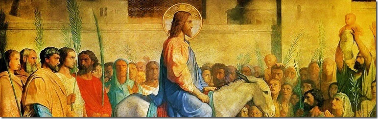 Nella Bibbia troviamo un episodio simile a quello dell’ingresso di Gesù in Gerusalemme. È quello che si riferisce alla tormentata intronizzazione di Salomone quale successore di Davide sul trono di Israele. Leggiamo nel libro dei Re: “Il re Davide fece chiamare il sacerdote Zadòk, il profeta Natan e Benaià figlio di Ioiadà. Costoro si presentarono al re, che disse loro: “Prendete con voi la guardia del vostro signore: fate montare Salomone sulla mia mula e fatelo scendere a Ghicon. Ivi il sacerdote Zadòk e il profeta Natan lo ungano re d’Israele (1Re 1,32-34). Gesù, quale discendente di Davide, viene introdotto su un puledro figlio d’asina, ad occupare il posto di Re che gli era stato preparato. Gesù in groppa al puledro guarda Gerusalemme: Giovanni Crisostomo dice che “qui il puledro raffigura la Chiesa e il popolo nuovo che fin a quel momento era impuro e che diviene puro, quando Gesù si siede su di esso”. E continua osservando: “Notate qui come si mantiene il rapporto tra l’immagine e la realtà. Gli apostoli che sciolgono gli animali: sono infatti gli apostoli che hanno chiamato sia gli ebrei sia noi alla fede; e per mezzo loro siamo stati condotti a Cristo”