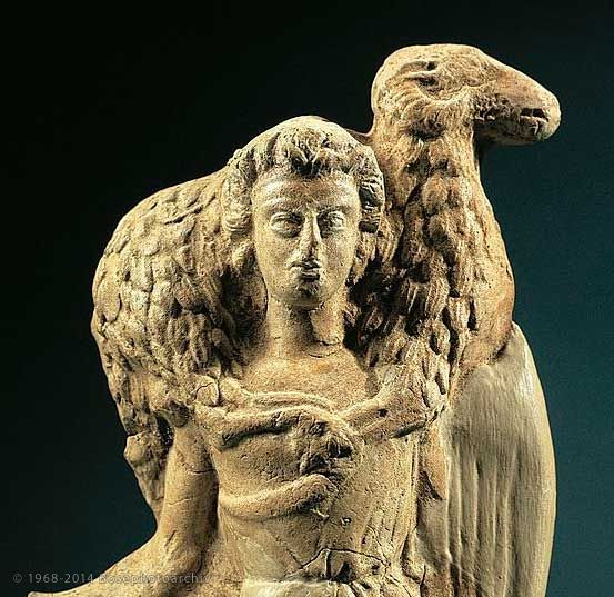 Quello che vediamo rappresentato nella prima immagine è un crioforo ovvero il portatore di un ovino sulle spalle. Le prime rappresentazioni greche di criofori sono molto antiche. La loro raffigurazione è spesso proposta in un ambiente cultuale per cui rappresentano colui che porta l’animale per il sacrificio o la stessa divinità che lo accetta. Esistono infatti anche statue dette moscoforo ovvero colui che porta un bovino sulle spalle.