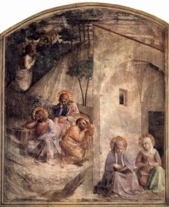 Les deux sœurs vivent réconciliées. C’est ainsi que le peintre dominicain Fra Angelico les représente dans une fresque (à Florence). Toutes deux assistent (spirituellement) à l’agonie de Jésus au jardin. Tandis que les trois disciples dorment, elles veillent, pénétrées du mystère. Marie lit la Parole, Marthe l’écoute avec attention et tendresse. Les deux « épouses » cohabitent en paix.