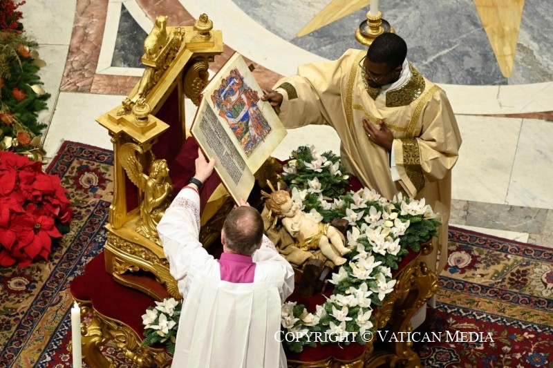 Hermanas y hermanos, la contemplación del Verbo hecho carne suscita en toda la Iglesia una palabra nueva y verdadera: proclamemos, pues, la alegría de la Navidad, que es fiesta de la fe, de la caridad y de la esperanza. Es fiesta de la fe, porque Dios se hace hombre, naciendo de la Virgen. Es fiesta de la caridad, porque el don del Hijo redentor se realiza en la entrega fraterna. Es fiesta de la esperanza, porque el niño Jesús la enciende en nosotros, haciéndonos mensajeros de paz. Con estas virtudes en el corazón, sin temer a la noche, podemos ir al encuentro del amanecer del nuevo día.