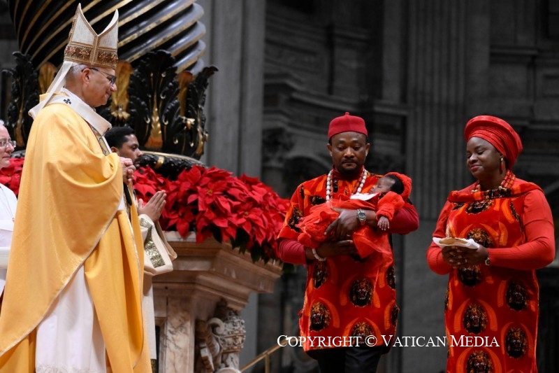 Sœurs et frères, la contemplation du Verbe fait chair suscite dans toute l’Église une parole nouvelle et véridique : proclamons donc la joie de Noël, qui est la fête de la foi, de la charité et de l’espérance. C’est la fête de la foi, car Dieu devient homme, naissant de la Vierge. C’est la fête de la charité, car le don du Fils rédempteur se réalise dans le dévouement fraternel. C’est la fête de l’espérance, car l’Enfant Jésus l’allume en nous, faisant de nous des messagers de paix. Avec ces vertus dans le cœur, sans craindre la nuit, nous pouvons aller à la rencontre de l’aube du jour nouveau.