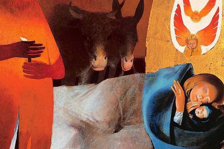 Il bue si inginocchia nella paglia, il fiato che si condensa nell’aria fredda. Accanto a lui, l’asino riposa. Davanti, il Bambino.