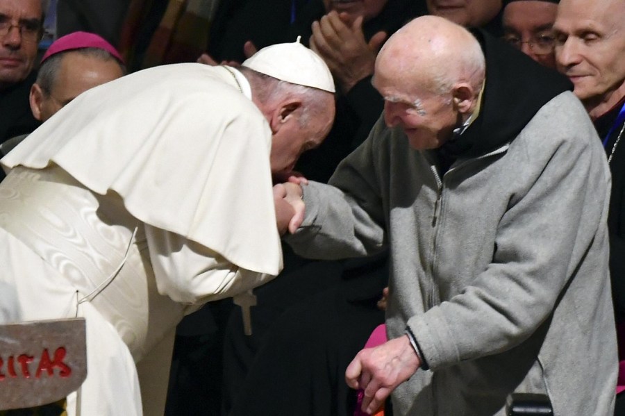 Papa Francesco omaggia padre Jean-Pierre Schumacher, sopravvissuto alla strage di Tibhirine, Rabat, Marocco, 31 marzo 2019 (Ansa)