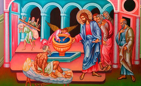 Gesù, salito a Gerusalemme, passa accanto ai cinque portici dove si radunano gli infelici di Israele. L’ambiente è Betesda, che significa “casa della misericordia”, una specie di rifugio per ammalati d’ogni genere, al centro del quale c’era la piscina dell’acqua miracolosa. La figura del paralitico viene descritta con pochissimi tratti; ma se ne sottolinea l’importanza e, forse, l’apatica rassegnazione. Giovanni intende mettere in risalto il gesto di Gesù, la sua iniziativa: nessuna preghiera da parte del paralitico, nessun segno di fede; anzi, egli non sapeva chi fosse il suo guaritore. La descrizione degli ammalati sotto i portici della piscina sono indicati da tre categorie: ciechi, storpi e paralitici. Giovanni, con queste tre immagini, vuole indicare anche la reale condizione dell’uomo, nel momento in cui Gesù lo raggiunge: la cecità, la mancanza di libertà di movimento e la paralisi. L’attenzione del lettore si concentra subito su uno di quei malati. Il tema della guarigione diviene così centrale; il termine guarito ritorna tre volte a scandire la narrazione. Si tratta di un termine tecnico usato nei santuari pagani. Santuario della devozione popolare agli dèi salvatori, molto diffusa nel paganesimo. Santuari di tal genere pullulavano nel mondo antico un po’ dovunque, anche nel giudaismo dell’epoca.